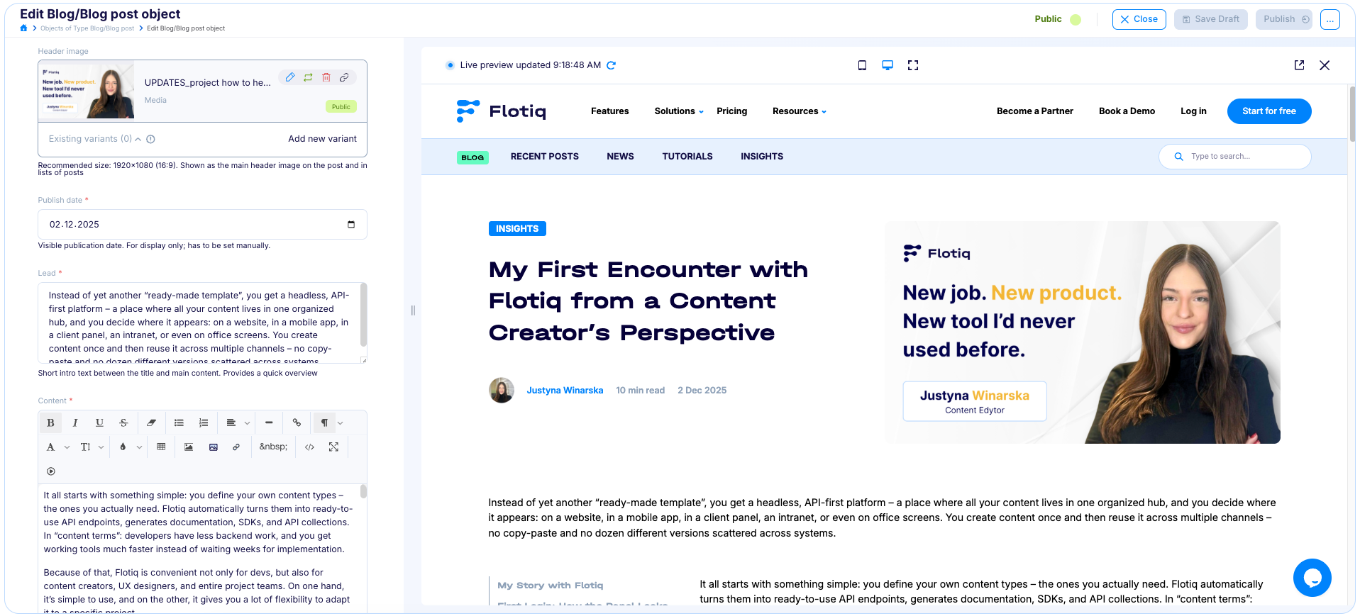 This is one of my favourite things about Flotiq. Thanks to the preview option, every time I change something, I can see with one click exactly how the content or element will look on the page. I can adjust it freely and shape the final result exactly the way I need.