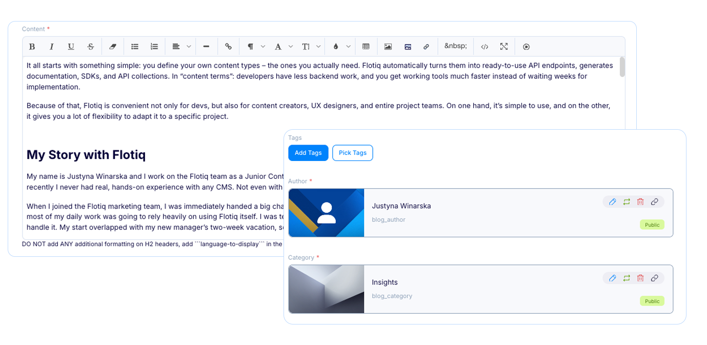 From all the time I’ve spent in the Flotiq panel, I’ve taken away one important lesson: a headless CMS doesn’t have to be complicated for a content person. It can actually make your work easier by organizing data, keeping things consistent, and giving you space to focus on what matters most: clear, thoughtful communication with your audience. You just need to give yourself a moment to shift your perspective and learn to look at content in a more structured way.