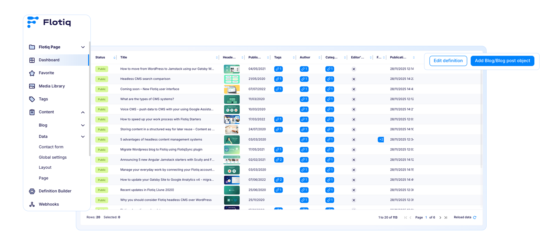 The list of entries looks a bit like a well-organized spreadsheet – but one you don’t have to be afraid of. I can see titles, dates, statuses, I can filter and search by specific phrases. Flotiq doesn’t bury me in technical details I don’t need as a content creator. Front and center are the things that matter most to me: content, its structure, and order.