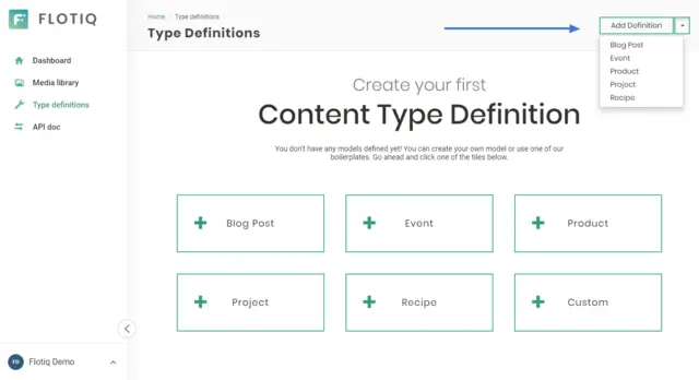 Regardless of how complex applications you're building - we understand that jumpstarting your work is important. You can now create new Content Types with a number of predefined content type boilerplates. You will find the boilerplates in the top right corner of the Type definitions screen, right next to the "Add Definition" button.