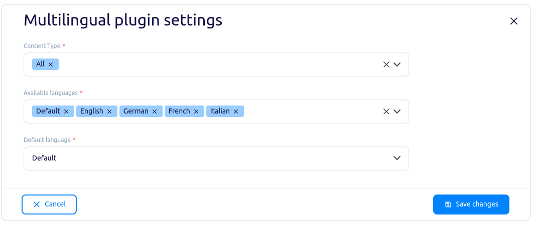 A plugin was created to support adding translation fields to data types and the ability to switch between languages while editing an object. Added the option to set a language named "Default"