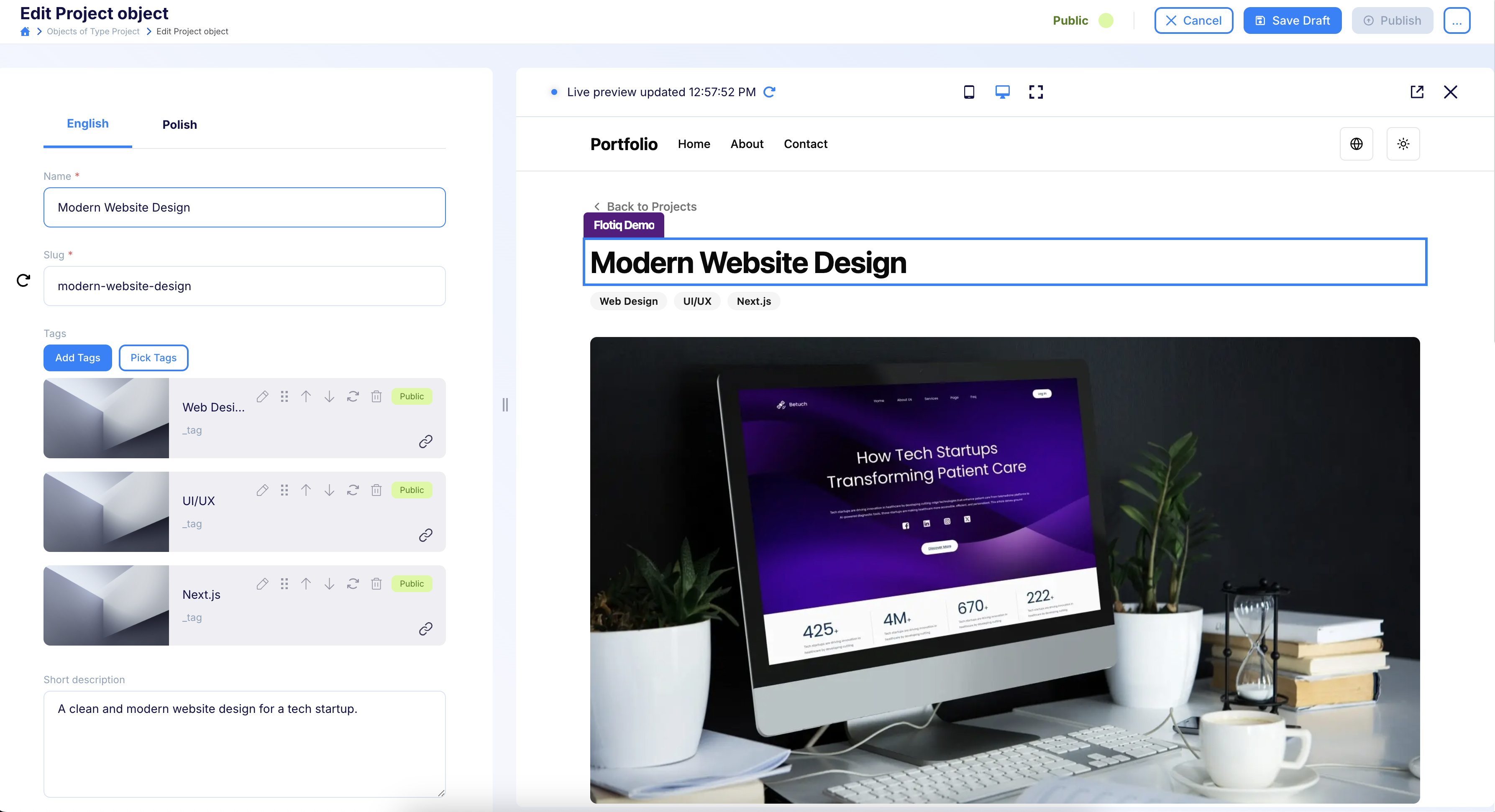 See a real-time preview of your content while you edit, displayed right next to the editing form.