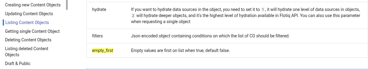 Until now, when sorting objects by a text field, any objects with an empty value in that field would appear at the end of the list. Now, this behaviour can be changed by providing the empty_first=true parameter, which will place objects with empty values at the beginning of the list.