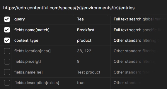 Contentful's full-text search is built into the standard entry listing endpoint. It allows global searches by any text field or field-scoped searches by content type, with features like geolocation and filters (equal, range) for advanced result filtering.