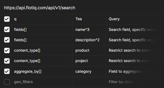 Flotiq offers a dedicated endpoint for full-text search, enabling simple and advanced searches across all or selected object types. It includes geolocation support and result aggregation (useful for categorizing search results), and allows specifying searchable fields and their weights for customized search results.